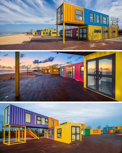 ??? 公司生產的幾十臺創意集裝箱房項目落戶煙臺龍湖里蹦島,為當地的海岸線添加了一道靚麗的風景線,雷悅重工有限公司從創意集裝箱房的設計,生產,裝修,安裝總用時45天,實現比傳統建筑減少建筑垃圾200余噸,縮短建筑周期60余天,是隨時可以分解移動得建筑產品。